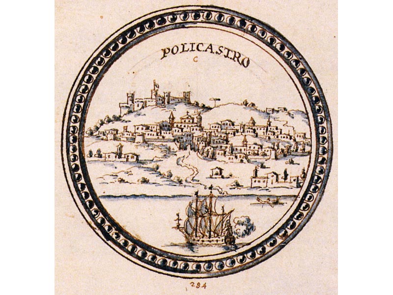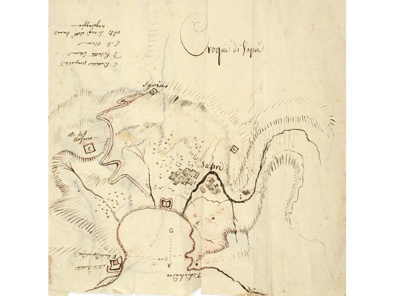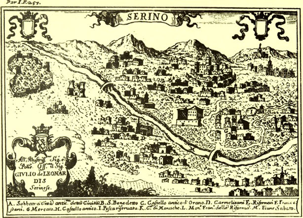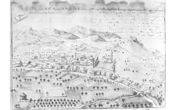 Veduta della città di S. Agata de’ Goti, con il camino dell’acquedotto detto di Carmignano, e Cimminiello, come lo dimostra la linea di rosso LEGGI