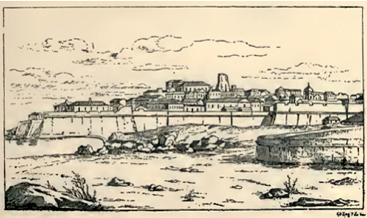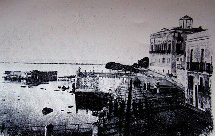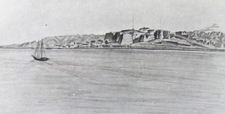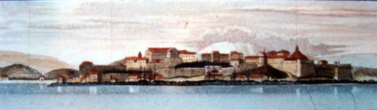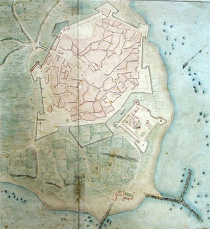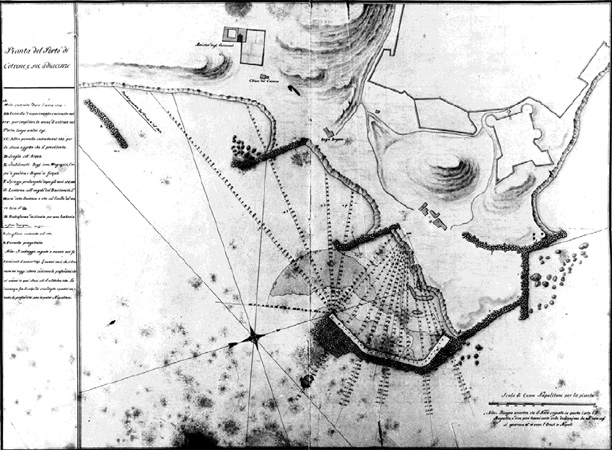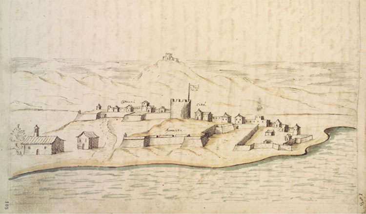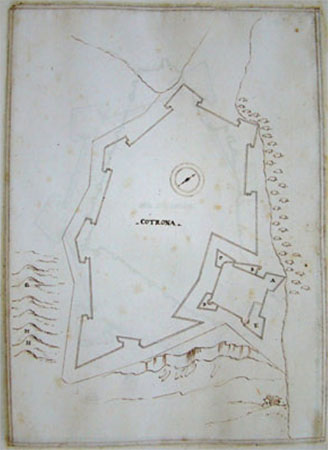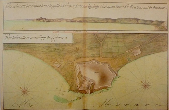 Veüe de la ville de Cotrone dans le Golfe de Tarente faite sur la plage à l’est quart-desud d’icelle à trois mil de distance. Plan de la ville et moüillage de Cotrone LEGGI