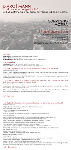 DiARC | MANN tra ricerca e progettualità Un hub patrimoniale per azioni di sviluppo urbano integrato Convegno-Mostra 11 aprile 2022, ore 9:30 Aula Magna, Palazzo Gravina Microsoft Teams: https://bit.ly/3x35fWT