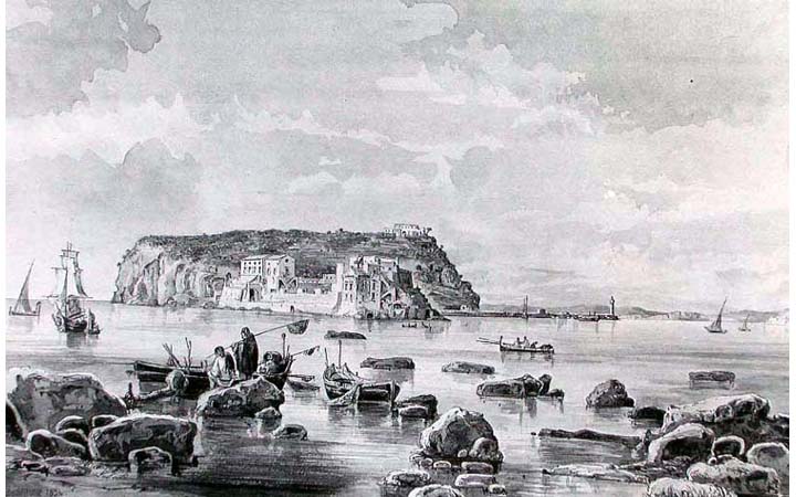 Il disegno a seppia acquarellata su carta mostra una veduta dell’isolotto di Nisida prima della realizzazione del ponte di collegamento con la terraferma realizzato nel 1934.